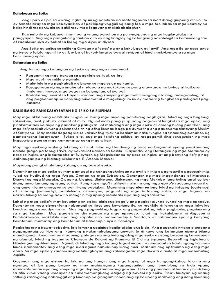 Ang epiko ay nanggaling sa salitang griyego na epos na may kahulugang. Scales weighting ng. Ang epiko ay tulang pasalaysay na nagsasaad ng kabayanihan ng pangunahing tauhan na nagtataglay ng katangiang nakahihigit sa karaniwang tao na kadalasan siyay buhat sa lipi ng mga diyos o diyosa.