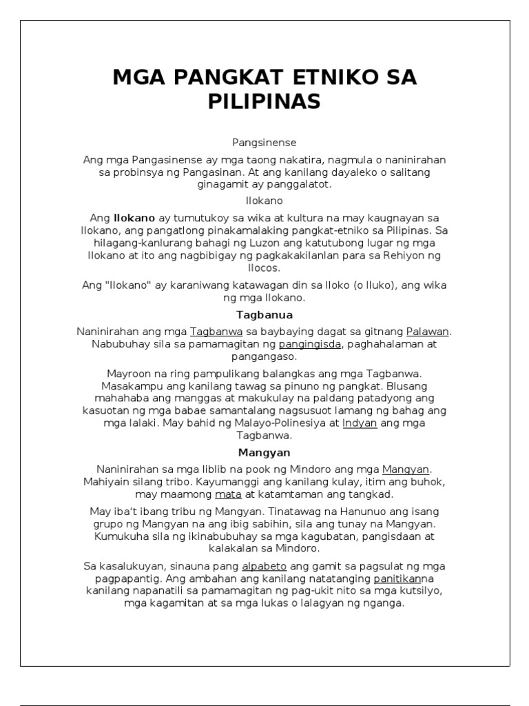 Hatiin ang klase sa apat na pangkat. Republic of the Philippines ay isang malayang estado at kapuluang bansa sa Timog-Silangang Asya na nasa kanlurang bahagi ng Karagatang Pasipiko. Ang tinatawag na mga pangkat-etniko sa Pilipinas ay maaaring ipakahulugan na isang pag-uuri o sarilinang pagkakakilanlan ng mga Pilipino batay sa kanilang lipi wika relihiyon o kasaysayanMula hilaga hanggang timog ang pinakamarami sa mga pangkat na ito ay ang mga Ilocano Pangasinense Tagalog Kapampangan Bicolano at BisayaPinaniniwalaaang kabilang ang mga pangkat na ito sa.