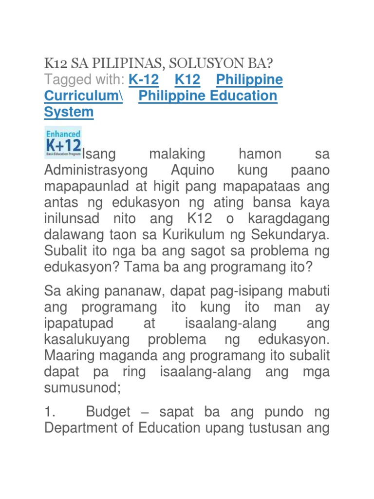 Kung hindie maari mo bang ibahagi ang iyong pananaw. Jun 11 2012 Ang K-12 kinder to grade 12 ay isang programang naglalayong palitan ang kurikulum ng elementarya at sekuundaryang edukasyon sa Pilipinas at dagdagan ito ng dalawang taonNoong nakaraang taon inumpisahan ang programa sa pamamagitan ng pagpapatupad ng universal kindergartenNgayong Hunyo naman ay uumpisahan na ang bagong kurikulum para sa mga mag-aaral na papasok ng. Isa itong programa para sa edukasyon na upang maging paraan upang umunlad ang bansa.