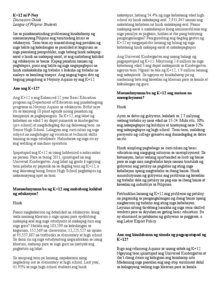 Posisyong Papel Tungkol Sa Pag Iimplementa Ng K 12 Kurikulum